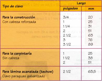 Los clavos. Son fundamentales para unir trozos de madera. Es importante elegir el tipo de clavos más adecuado para el tipo de madera con la que se está trabajando. Por ejemplo, el largo del clavo debe ser aproximadamente el doble del espesor de la madera que se desea unir. La unidad de compra de los clavos es el kilogramo.