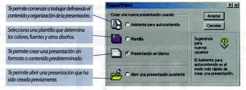 de una presentación hay varias opciones. Selecciona la opción PRESENTACIÓN EN BLANCO que desplegará un cuadro de diálogo con una serie de diapositivas predeterminadas.