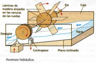 dibujo. El aspa toma la forma de un molino de agua conectado a una polea la