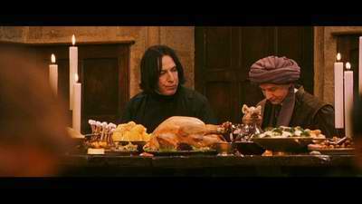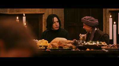 Snape is talking to Quirrell at the feast