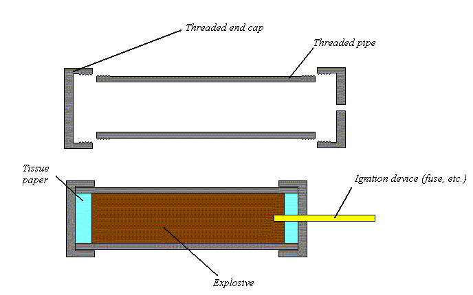 | Pipe Bomb Plans First get a pipe with 2 screws able and unscrew able ends put the bottom end on. Next drill a hole in the top one for the fuse. Next put tissue paper at the bottom of the pipe then fill the inside tube up with explosives E.G. gunpowder from fireworks or from a gun store. Then pack the fuse in and around the gunpowder then put the end out the drilled hole. Next put some more tissues in the top of the pipe and compact the gunpowder (explosive) Screw on the top making sure the fuse doesn't snap and there you go, a pipe bomb! |