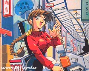 | This is the 7th page of Snapshots taken from the PC-FX game TENCHI MUYO! OVA 9.8, by AIC Spirits. The gang make their way downtown, and Sasami drags off Tenchi to find the perfect present... leaving Aeka stuck with Mihoshi. Ugh. No sooner than Tenchi n' Sam are near the shops, when they are set upon by Makura! She was last seen in the two TM! CD Drama's as both a supermarket checkout chick (OST 3), and working in a chocolate shop (Sasami's Valentine's Day). Now... she's a drive-by pizza seller! |