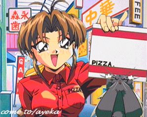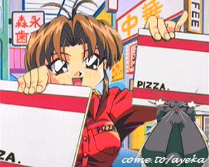 | Before Makura can get our hapless duo to buy her new carrot pizza's (?!), they're all munched down by Ryo~chan... leaving Tenchi to foot the bill. Looks like we're all outta' money. Crap. |