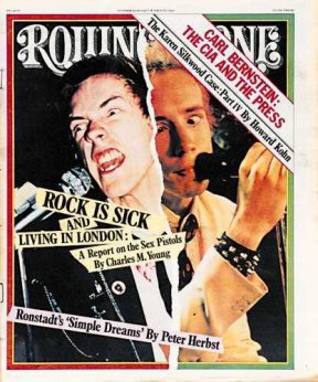 | ROLLING STONE OCTOBER 20TH 1977 ROCK IS SICK AND LIVING IN LONDON A Report on the SEX PISTOLS By Charles M. Young A little before midnight, my taxi arrives at a club called the Vortex. The weather is atypically dry, and the neighborhood, like the rest of London, is a shopping district with it's eye on the tourist rade. Half a block away ten or twelve teenage boys dressed like horror-movie morticians jump up and down and hit each other. Their hair is short, either greased back or combed to stick straight out with a pomade of Vaseline and talcum powder. Periodically, one chases another out of the pack, grabs the other's arm and twists it until he screams with pain. Then they rush back laughing and leap about some more. Sitting oblivious against a building, a man dressed in a burlap bag nods gently as a large puddle of urine forms between his legs. |
