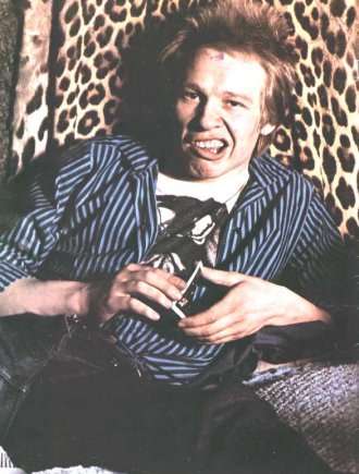 | The nose is wide, the skin pallid. Conditioned by six months of reports about the Sex Pistols' proclivity for violence, I half expect him to assault me. But his hand is limp as we shake and his eyes do not meet mine when I introduce myself. He is, of all things, shy. "It's just a laugh, not really that violent," he says when I ask about their dancing. "You can take it which way you want: some laugh, some get paranoid. They want to prove they aren't posing." "A lot of people have missed the satire," I say. "Some of the press are even trying to link you with the fascists." "I can't be bothered with that shit," he replies. "It's just what they want to read into it. When we first started playing, before all the articles came out, people would come up and say they'd never seen anything so funny in their lives." |