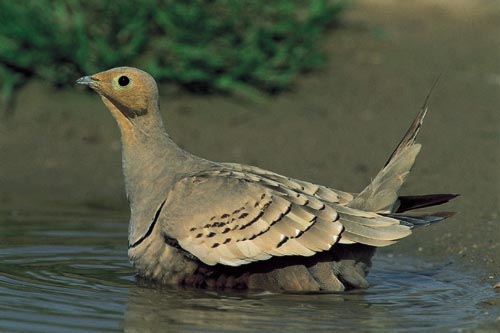 There are four species of sand grouse that are regularly found in Arabia. The chestnut-bellied is a fairly common breeding resident, found in the foothills of the mountains, gravel plains and desert regions of the Emirates. An elegant bird with a long, pointed tail and a conspicuous breast band. |