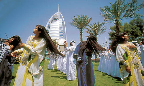 Traditional music and dancing play a prominent role in the cultural life of the United Arab Emirates. It is common to see colourful displays of folkloric dancers at a wide variety of occasions, such as sporting events, weddings, and national festivals. The style of dancing most frequently seen is known as the Ayyala tradition. Rows of male dancers, accompanied by traditional instruments such as the drums or Tubool, recreate a battle using sticks as swords, while the dance movements themselves weave a story of the combat. The women, dressed in their attractive traditional costumes with their long black hair flowing gracefully with the music, perform the Na'ashat. |
