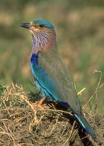 The Indian roller preys on small invertebrates and lizards and is often seen perching for long periods in search of its food species. During courtship the roller climbs high into the sky before tumbling and rolling in the characteristic display that gives it its common name. It nests in trees or buildings using twigs and other vegetation to build its nest. In March or April a clutch of three to five eggs is laid. |