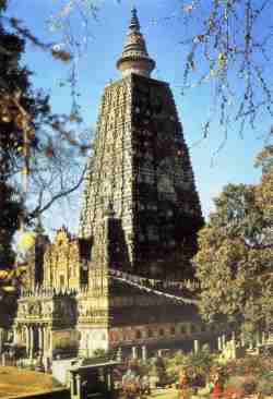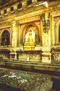 菩提樹東有精舍。高百六七十尺。下基面廣二十餘步。壘以青[專*瓦]塗以石灰。層龕皆有金像。四壁鏤作奇製。或連珠形。或天仙像。上置金銅阿摩落迦果(亦謂寶瓶又稱寶臺)。東面接為重閣。檐宇特起三層。榱柱棟梁戶扉寮牖。金銀彫鏤以飾之。珠玉廁錯以填之。奧室邃宇洞戶三重。外門左右各有龕室。左則觀自在菩薩像。右則慈氏菩薩像。白銀鑄成。高十餘尺。精舍故地。無憂王先建小精舍。後有婆羅門更廣建焉。
