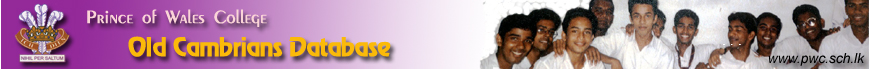 No:54, Walana Road, Panadura, Sri Lanka. | 94-01-935820 (Sri Lanka) | South Korea | University student | Hanseo University, Dormitory, 360 Daegok-ri Haemi-myun Sosan-si, Chungnam, Korea.(356-706) | 82-41-660-1176 | 2001 A/L - Maths | Proud to be a Cambrian. Nice job guys, keep going..... |