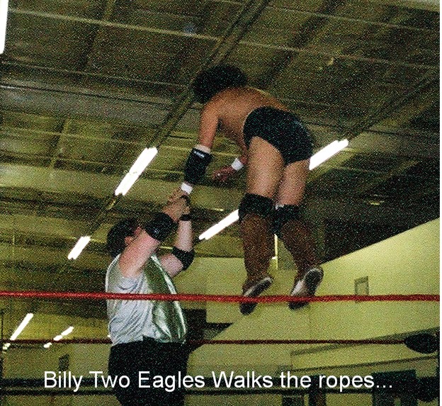 After the intermission, Skag Rollins made his way to the ring for the main event of the night...The WSW championship was on the line with Skag challenging Billy Two Eagles for his WSW heavyweight championship...This match was a brutal back and forth struggle between the two competitors...Some of the most intense chops to the chest I've ever seen (Naitch wouldve been proud....whoooooooo!!!!)...Billy even pulled off his patented Old School maneuver, where he walks the top rope while holding his opponent in a wristlock and comes down and the momentum carries it over into an armdrag, which is always exciting to see...By the way, Billy is actually the guy who taught the Undertaker how to walk the rope like he does (theres a little bit of knowledge for you youngsters)...These two went at it until the ref happened to be in the wrong place at the wrong time, and got knocked out by an accidental chair shot...while the ref was out ,Damon Scythe came out and blasted Billy with a few wicked shots from his kendo stick...Skag rolled over for the cover, and Damon rolled the ref back into the ring, for the 1...2...3...and your new WSW heavyweight champoin....Skag Rollins...After the match, promoter/commissioner Walter Meek came out and suspended Damon for interfering in the match, and made the announcement that Billy would get a rematch next month, in his favorite kind of match...An Indian Strap Match, so if your in the Pacific Northwest on the 12th of June, I'd make it a point to be in Chehalis, Washington for this one...It's gonna be huge...Thats it for now, so till next time, keep on supporting the independant wrestling scene, and we will see ya at the matches!!! |