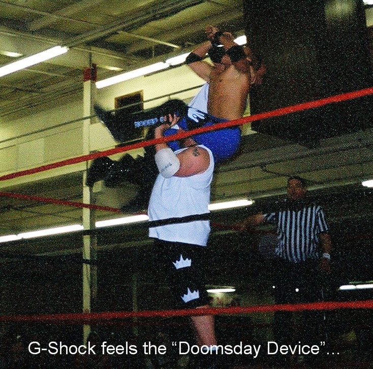 Well, anyways, the show kicked off with a pretty good match between Pitman, and Critter...The contrast in their styles made for an interesting match...Critter was just a powerhouse in the ring, while Pitman show a pretty good array of kicks and pretty good mat skills...Good back and forth action, until Critter hit Pitman with a brutal spear to end it....WINNER: Critter