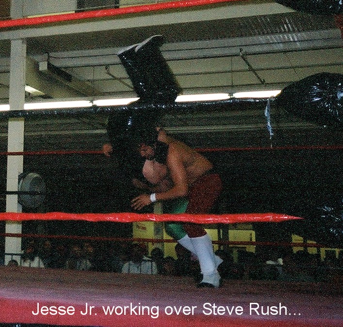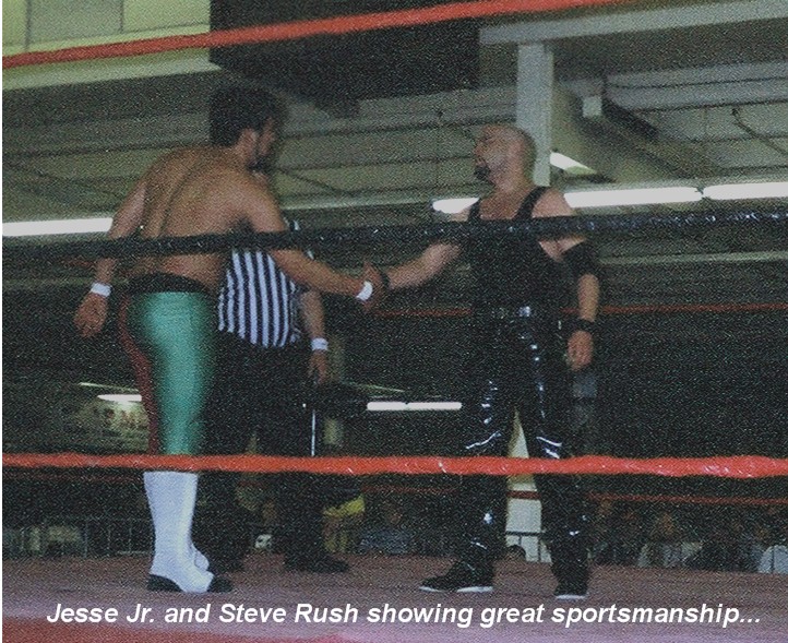 The next match pitted Jesse Jiminez vs one half of the tag team champions, "Smooth" Steve Rush...This match started off a bit slow...BUT, was probably the most weird thing I've seen in a match (funniest too!!!)...Steve started off by putting the hand up in challengin Jesse to a test of strength...Each time Jesse went for the hand, Steve would switch hands, which got a good laugh outta everyone, even Jesse...Eventually things got even sillier, when the joking turned into a nipple twisting match...the twisting went back and forth for a good minute or two, and ended with referee Mark Watson getting his twisted...this was a hilarious scene!!!...Once they really got down to business...The match was a good back and forth struggle between two pretty evenly matched guys, which was highlited by the two taking it out to the floor, where Steve took a hard, and I mean hard bump on the floor (no mats i must add!!!) after being clotheslined by Jesse...Eventually they made their way back into the ring where Steve eventually surprised Jesse and rolled through Jesse's running powerslam attempt...Steve's momentum caused him to roll right through the slam, and pin Jesse for the win...WINNER: Smooth Steve Rush