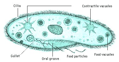 Introduction Paramecia are among the most complex single-celled organisms. They swim rapidly, usually in a corkscrew fashion, by means of coordinated, wavelike beats of their many short, hairlike projections, called cilia. Paramecia feed on smaller organisms, such as bacteria. A thin layer of clear, firm cytoplasm (ectoplasm) lies directly beneath the flexible body membrane (pellicle) and encloses the inner, more fluid portion of the cytoplasm (endoplasm), which contains granules, food vacuoles, and crystals of different sizes. Paramecia have one large nucleus and one or more smaller nuclei. A network of fibers below the cell surface connects the cilia. Embedded in the ectoplasm are spindle-shaped bodies (trichocysts) that may be released by chemical, electrical, or mechanical means. Originally believed to be a defense reaction, they appear to be extruded as a reaction to injury or for use as an anchoring device. Diagram They feed on small organisms such as bacteria and even other smaller protozoa. Food in the gullet forms a ball which passes into the protoplasm as a food vacuole. The food is digested as the vacuole passes through the organism, and the waste is passed out from a special place called the anal pore. Contractile Vacuoles Cilia and Ciliary Motion The speed of motion is about four times its own length per second. It moves so quickly that microscopists have to add a thickening agent to the water to slow it down to study it. As the paramecium moves through the water it rotates on its axis and small particles of debris and food are collected and swept into the gullet. If a paramecium comes across an obstacle, it stops, reverses the beating of the cilia, swims backwards, turns through an angle and moves forward again on a slightly different course. Behavior - or How does the