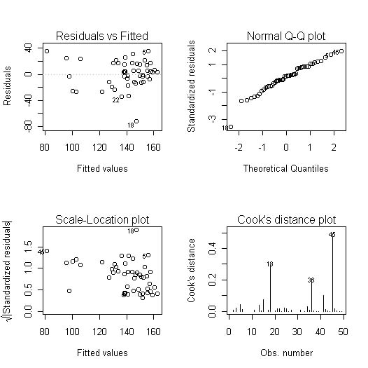 Residual standard error: 20.99 on 46 degrees of freedom Multiple R-Squared: 0.451, Adjusted R-squared: 0.4271 F-statistic: 18.89 on 2 and 46 DF, p-value: 1.024e-06 Correlation of Coefficients: