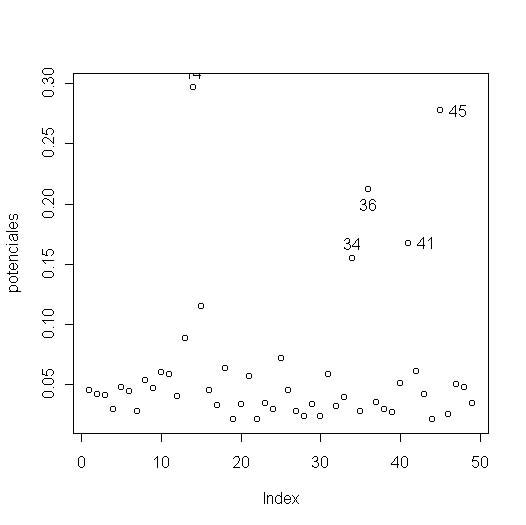 > matriz.modelo<-model.matrix(modelo.FINAL) #creamos la matriz de diseño > potenciales<-hat(matriz.modelo) > potenciales<-hat(matriz.modelo) #creamos potenciales que contiene la matriz hat del modelo > plot(potenciales) #hacemos un gráfico de potenciales para ver los mayores > identify(potenciales) #identificamos sobre el gráfico el nº de la observación |