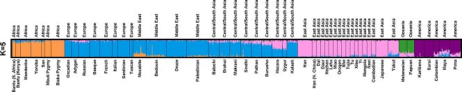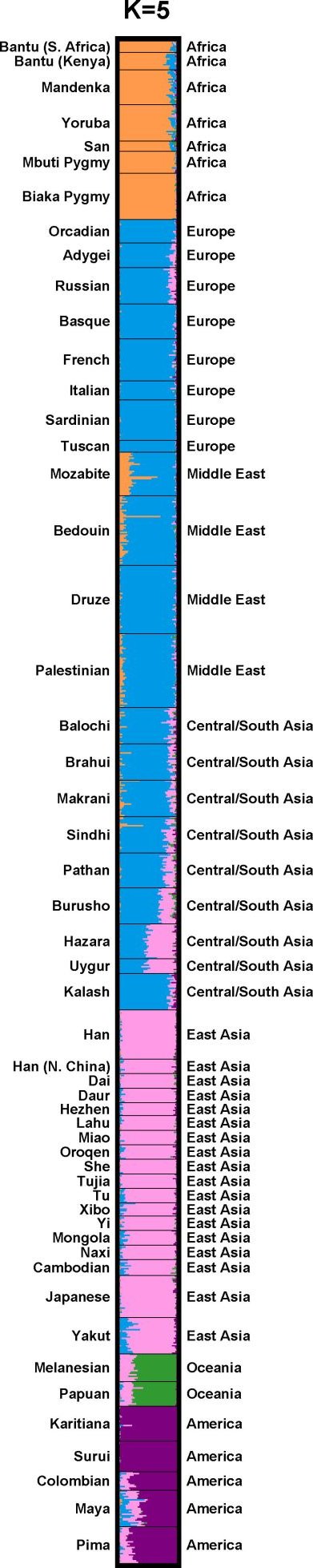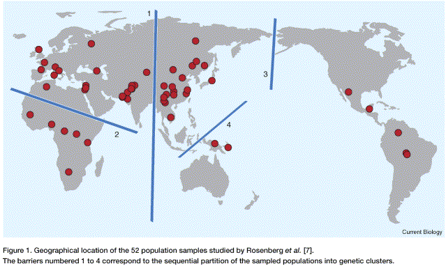 "Assuming that three populations are present (K = 3) leads to a split of individuals found in sub-Saharan Africa from those found in Europe, North-Africa, the Middle East and Pakistan (Figure 1, barrier 2). With K = 4, a cluster of Asiatic and Oceanian individuals separates from Amerindians (Figure 1, barrier 3). With K = 5, an Oceanian cluster appears (Figure 1, barrier 4), and we are left with the pleasant picture of a world divided into genetic clusters that closely correspond to five geographic regions: sub-Saharan Africa, East Asia, Oceania, the Americas and the rest, comprising Europe, North Africa and West Asia. ... It thus seems that these five groups do correspond to major subdivisions of the human population."