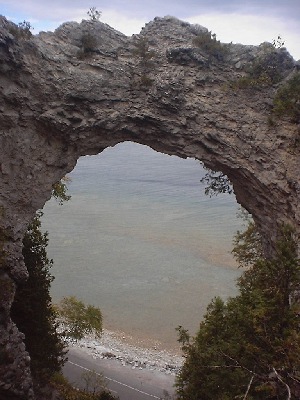| Ah! Here we are, at Arch Rock! No, you don't need to watch your step as there's this big fence in the way for clumsy acrophobic idiots like me, but would you look at that view! There's the road way down on the beach, where you can ride your bike all the way around the Island, a distance of just over eight miles. (We did that once, on foot...but bicycle...*ugh*...never do that again.) And, wouldn't you know it, there's even an Indian legend behind this baby! Yep, there is! According to legend, an Indian father, angered that his daughter had fallen in love with a sky spirit (y'know how it goes), took her up to the top of the rock and tied her there, leaving her behind. She cried and cried and her tears melted the rock below, so that it formed an arch. And lo and behold, who should swoop down and rescue her but that same spirit, who whisked her away to live in the sky with him. *Sniff-sniff.* Sorry--stories like that bring out the worst in me--I'm just a hopeless romantic, aren't I. |