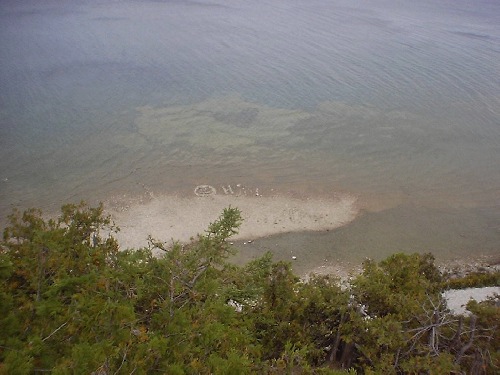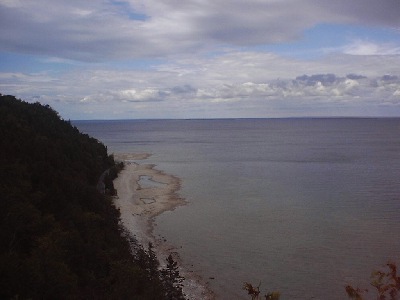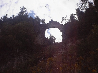 | Here is the absolutely stunning view from Arch Rock. You should see my pics of the view from last year, when it was sunny, as they are absolutely stunninger. You simply can't see the color the sun brings out in the lake in this picture, what with those stupid clouds. *Grumble grumble...* ((Shove)) DON'T FALL!! Heh heh, made ya jump. Jeez, don't have a conniption, I was only kidding. ;P |