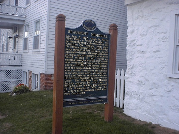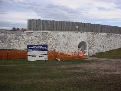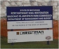 | Fort Mackinac from behind. (Ignore the cute little cockapoo.) This orange fencing was pretty much around the whole thing, because of the restoration. Let's take a closer look at that sign. | ||||||||||||||||