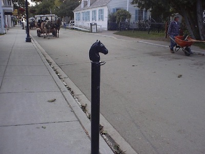 | This is what's known as a parking space on Mackinac Island! Yuk yuk yuk! LOOK! What's that coming this way?? Dare we hope??... |