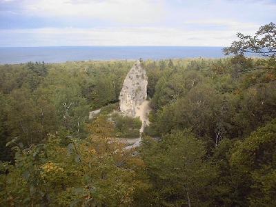 | Here's a closer, ground view of Sugar Loaf, and a better view of that stupid trail. And WOULDN'T YOU KNOW IT?--there are legends surrounding this, too! >:) (You just *knew* I was going to say that, didn't you?) According to one, Sugar Loaf was filled with honey (mmm!) and was the home of Gitchi Manitou, the Great Spirit. According to another, it's an Indian who was stupid enough to ask the spirit Manabozho for eternal life. Well, he got it, all right--by being turned into a big rock. Ha ha ha ha ha!! That's what you get for asking for immortality!! |