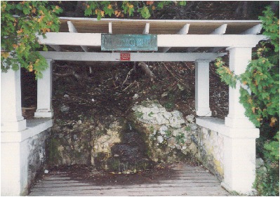 | Dwightwood Springs, not too far from Arch Rock. According to the guidebook: "Nearby is Dwightwood Springs, the most famous of the natural flows of clear, cold water that dot the island. Named after the son of an old-time summer cottager, this spring originates deep in the bluff, not far from Arch Roch. Although popular as a place to quench one's thirst in the early days, the water does not meet today's health standards and is not recommended for drinking." Not recommended? Does that mean still allowed? Not that I'm, *ahem,* thirsty... |
