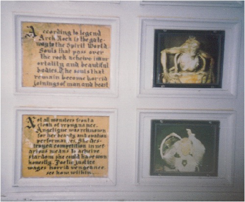 | Two of the displays in the Haunted Theater wax museum. The top is the one dealing with Arch Rock. In case you can't read the fine print, here you go: "According to legend Arch Rock is the gateway to the Spirit World. Souls that pass over the rock acheive (sic) immortality and beautiful bodies. The souls that remain become horrid joinings of man and beast." (The accompanying display is some weird monster with human faces growing out of its chest. Ewwww, icky-poo!) The second display here is some unfortunate lady named "Angelique": "Not all monsters front a (?--word uncertain) of repugnance. Angelique was reknown (sic) for her beauty and ovation (?) performances. She destroyed competition in nefarious means to acheive (sic) stardom she could have won honestly. Poetic justice wages horrid vengeance. See how within." (Long story short--that's a face only a mother could love.) |