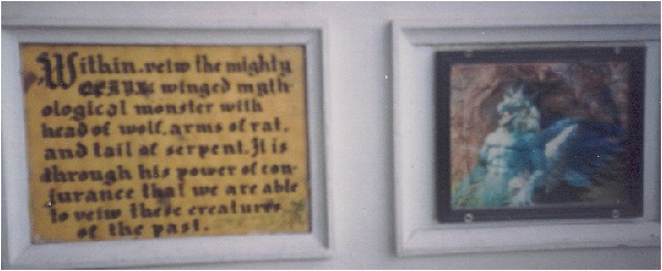 | The "Ocryx" display. (Man, I wish these were clearer, you should see the guy!) "Within, veiw (sic) the mighty OCRYX, winged mythological monster with head of wolf, arms of rat, and tail of serpent. (Note: He also has wings and horns.) It is through his power of conjurance that we are able to veiw (sic) these creatures of the past." Ocryx has always been one of my favorite displays. He stands in front of this lectern or something upon which is a spellbook of some sort, and there's this ugly little creature sitting at his feet. Ah, the stories I used to make up about him... ('Nother note--I have NOT been able to find anything about any "Ocryx" in Native American mythology, thus I believe the Theater people simply made him up.) |