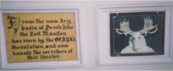 | The Mitchi Manitou display (also one of my favorites): "From the now dry basin of Devil's Lake the Evil Manitou has risen by the OCRYX's incantation, and now haunts the corridors of this theatre." So, that WASN'T a guy in an ape suit who freaked us out that one time!!... |