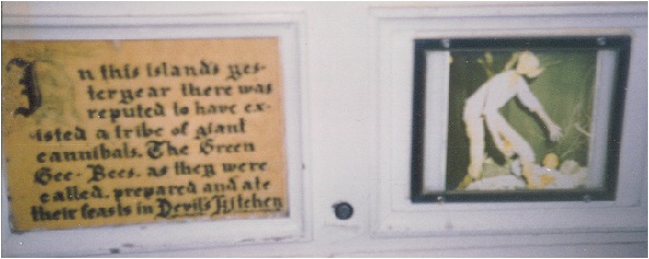 | The GeeBee display. (A runner-up for favorite.) "In this Island's yesteryear there was reputed to have existed a tribe of giant cannibals. The Green Gee-Bees, as they were called, prepared and ate their feasts in Devil's Kitchen." (In the display, the GeeBee (that's the spelling I somehow chose--I've also seen it spelled "Geebis") is holding onto the heart that he just tore out of a man's chest. Mmm, yummy. ;) ) |