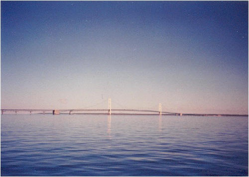 | NOTE: All the pictures previous to this one are pre-1999. Starting here are the pictures from 1999, the year previous to the original "Mackinac Island Tour." Need I once more say ENJOY?? This is the Mighty Mac, duh. That water looks nice. Even from someone who can't swim. Eegh. |
