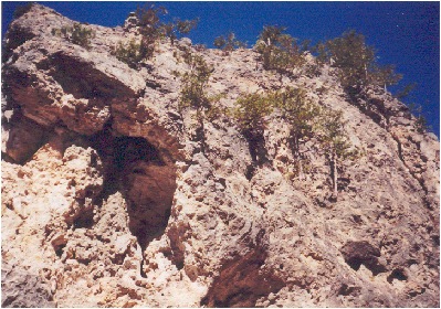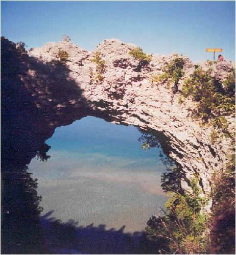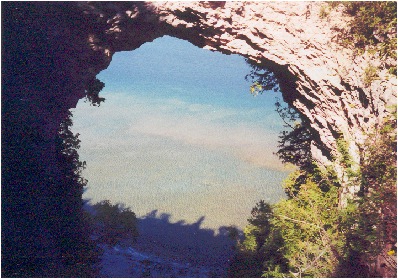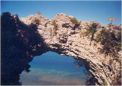 | This photo is not "real." Thanks to the wonders of modern technology (or more like the wonders of Print Shop Deluxe Version 10 ;) ), I was able to splice two separate pictures of Arch Rock, similar to those above, into one "panoramic" photo, so you can see exactly what it looks like to someone who is there looking at it from above. Ain't I bright! | |||||||||||||||