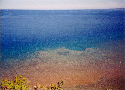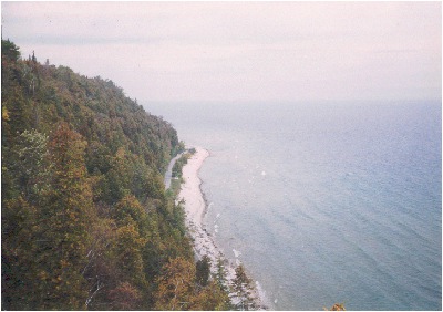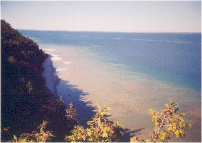 | Oopsie, I made a mistake with my "pre-1999" notice a while back. This here is a pre-1999 photo. I place it here so you can compare it to the photo which follows. This is the view of the shoreline from Arch Rock. (Either that or Nicolet Watch Tower. I can never remember which...) | |||||||||||||||