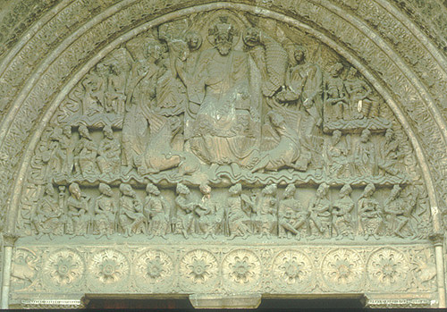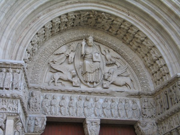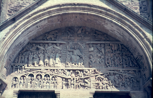 Vivió su momento álgido a principios del siglo XII, cuando fue construido el claustro y el pórtico de la antigua iglesia (1100-1125) con su magnífico tímpano de 5,68 metros de diámetro que, enmarcado por unas arquivoltas ligeramente apuntadas, descansa sobre un dintel ricamente ornamentado, un parteluz esculpido y dos jambas de perfil lobulado. El tímpano presenta el programa típico del Apocalipsis según la versión de san Juan (Ap. 4, 3-8). El tema se organiza alrededor de una superficie semicircular concebida como un arco de triunfo: Cristo en majestad, coronado, con el libro de la Palabra de Dios en la mano izquierda y bendiciendo con la derecha, está rodeado por el Tetramorfo y por dos serafines. Llenan el espacio 24 figuras más pequeñas, que llevan copas e instrumentos musicales, ordenados en tres registros (cosa que indica que la iglesia tiene tres naves), por debajo y por los lados del grupo central.