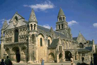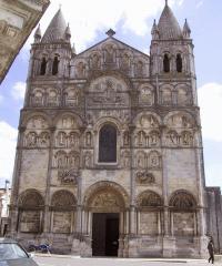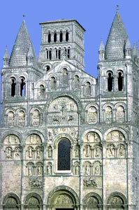 La antigua colegiata de Notre-Dame la Grande de Poitiers se edificó siguiendo los modelos de la catedral de Angulema, en la primera mitad del siglo XII. Lo más espectacular es su fachada que no deja adivinar la estructura interna del templo, por lo que recibe el nombre de fachada pantalla. Las torrecillas laterales presentan haces de columnas que sostienen linternas cupuladas, elementos característicos de la escuela de Aquitania. La fachada tiene tres pisos y viene determinada por una acentuada vertical constituida por la portada principal, la ventana superior y la mandorla del frontón. El piso bajo remite a una arquitectura de varias naves, con la portada central y las arquerías ciegas mientras que el piso intermedio se subdivide en dos zonas, mostrando las figuras de los apóstoles y los santos Hilario y Martín (o Marcial) circunscritas en arcadas, como si de un sarcófago se tratara. En el tercer piso contemplamos la mandorla, en la que se ubica Cristo con los símbolos de los evangelistas. Este esquema de división en la fachada no ayuda al efecto de unidad. Capiteles, arcos y arquivoltas se cubren de una suntuosa ornamentación, resultando un conjunto de gran belleza.