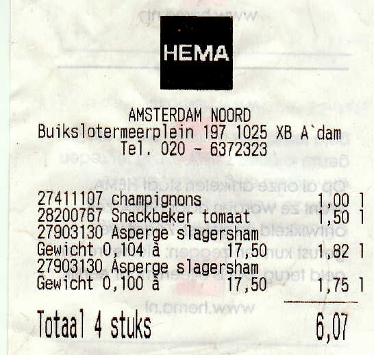 Later die avond vonden we de kassabon terug. Ook daarop stond geen lamsham vermeld, maar Aspergeham.