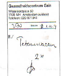 Dat deden we en ze gaf ons, bij wijze van reprimande, twee zeer pijnlijke prikken, één in de linker- en één in de rechterdij. Deed het pijn?", vroeg ze na afloop, zonder ook maar even te laten merken hoe kwaad ze wel was. Viel wel mee hoor, jokten we. Dat hadden we beter niet kunnen zeggen, want onmiddellijk schreef ze een receptje uit voor nóg twee prikken, die we over een maand krijgen toegediend.