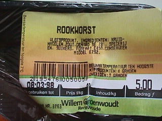 Waar moet dat heen? Krijgen we straks misschien ook kalfsvlees van koe? Of kuikenborst van soepkip? Of rundvlees rechtstreeks van gras gemaakt? Supermarkt Willem Groenwoudt echter maakt het nog bonter: regelmatig duiken op hun slagerij-afdeling bijzonder goedkope rookworsten op die, voorverpakt, slechts vijf gulden per twee stuks kosten. Nou, als dát geen koopjes halen is, dan weten wij het ook niet meer. En, zoals u op onderstaand plaatje ziet, ogen die rookworsten nog zeer smakelijk ook en is er op het eerste gezicht niets mis mee.