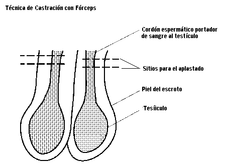 El método de los fórceps aplasta las ramificaciones sanguíneas e interrumpe solamente el abastecimiento de la sangre a los testículos. La inmovilidad del animal debe ser buena y es esencial porque el fórceps debe permanecer en una posición fija durante unos 10 segundos para poder aplastar la arteria.