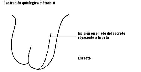 1. Haga las incisiones en la parte de afuera de la mitad más inferior de cada lado del escroto (ver figura).