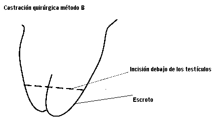 Si ha usado el Método de incisión B, la castración ha finalizado. Si ha usado el Método de incisión A, una vez a que ambos testículos se han quitado, Hay que hacer una incisión completa alrededor del flanco medio para asegurar un buen drenaje.