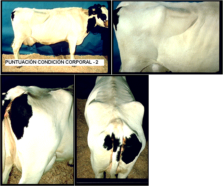 Vaca delgada. Los finales de las costillas cortas pueden sentirse pero las costillas y las vértebras ya no están tan destacadas. Las costillas cortas no muestran ese perfil raquítico. El hueso de la cadera y el pelvico siguen estando destacados pero la cavidad entre ellos es menos severa. El área alrededor de la cola y la tuberesidad isquiática esta menos hundida y la vulva esta menos destacada.