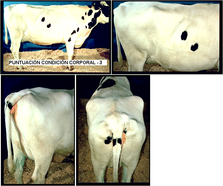 Vaca con condición corporal media. Las costillas cortas pueden sentirse aplicando una leve presión sobre ellas. La apariencia de aspecto raquítico ya ha desaparecido. El espinazo es una cadena redonda y los huesos pelvicos y de la cadera muestran una configuración redonda y suave en sus contornos. El área anal esta llena, pero no hay evidencia de depósito de grasas.