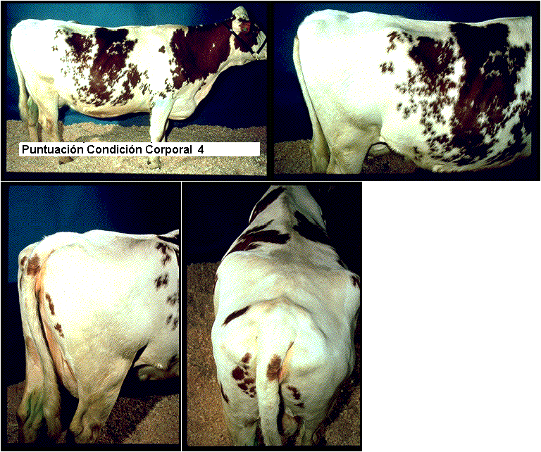 Vaca gorda. Las costillas cortas individuales pueden sentirse únicamente cuando la presión que se aplica es muy firme. Todas ellas están redondas y no muestran ningún perfil huesudo. La cadena del espinazo esta aplanada sobre las áreas del lomo y redondeada sobre el espinazo. Los huesos de la cadera están suavizados y el espacio entre los huesos de la cadera sobre el espinazo es plano. El área alrededor los huesos comienzan a mostrar áreas de deposito de grasas.
