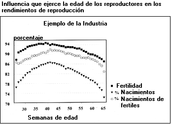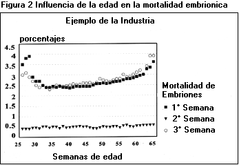 | Edad del lote reproductor | Mortalidad de embriones Embriones en mala posición Anormalidades de los embriones |