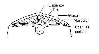 Figura 1. Solo la piel y la grasa cubren el espinazo y el área del final de las costillas cortas, haciendo que estas ubicaciones sean ideales para la puntuación de la condición corporal.