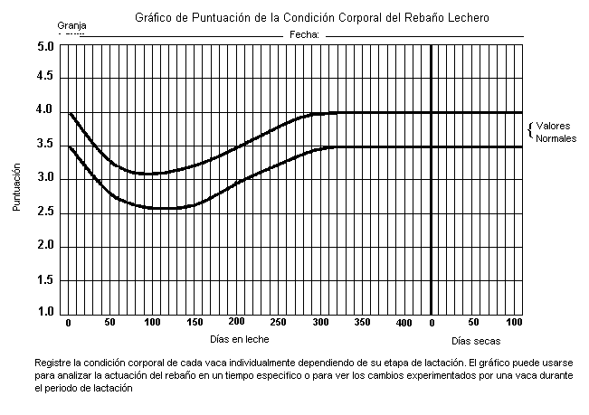 Las puntuaciones de la condición corporal oscilan desde 1, para una vaca muy delgada y sin reservas de grasas hasta la de 5, que implica una vaca excesivamente gorda. La puntuación ideal de la condición corporal está entre los valores de 3.5-4.0 al final del periodo seco y el parto y de 2.5-3.0, al pico de la lactación, las vacas no deberían cambiar más de 1 punto en su condición corporal en cualquier período de lactación. (Para mayor información lea el articulo " Manejo del Rebaño Lechero usando al Puntuación de la Condición Corporal ".) Las descripciones de las 5 condiciones corporales se describen en la pagina principal de este articulo.