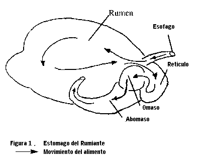 Estos microbios tienen la capacidad para descomponer la celulosa y la hemicelulosa, que son los componentes principales de los forrajes. Los microbios del rumen también descomponen a otros componentes de la dieta del animal, como la proteína y el almidón. El retículo es un órgano pequeño que actúa como un área de almacenamiento de los alimentos después de que estos han pasado el esófago. El omaso es un órgano que absorbe el agua desde la (disgesta = mezcla de alimentos y fluidos) antes de que estos lleguen al abomaso( estómago verdadero). Las enzimas digestivas propias de animal descomponen el alimento en el abomaso y en el intestino delgado. La absorción de estos alimentos ocurre principalmente mediante el intestino delgado (Figura 2). Los animales mono gástricos (no - rumiantes) (p. ej. cerdos, perros y el hombre) no son capaces de digerir eficientemente la celulosa.
