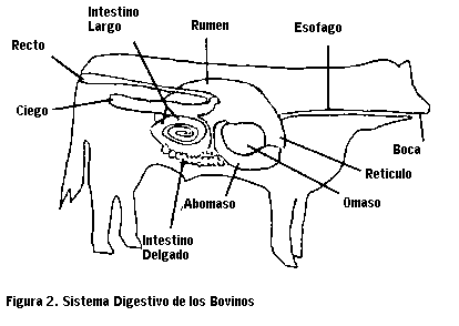 El ganado vacuno pertenece a una clase de animales llamados rumiantes. Este grupo incluye a las ovejas, cabras y ciervos. Los rumiantes tienen un sistema digestivo que los permite utilizar los forrajes (p. ej. heno, hierba) como una fuente importante de nutrientes. Estos animales tienen un aparto digestivo de gran (capacidad de hasta 200 L.), el fluido llena el órgano digestivo desde el principio de la vía digestiva llamado el rumen. El rumen contiene una población grande de microbios ( bacterias y protozoos). Mucha de la digestión inicial de los alimentos se realiza por los microbios del rumen (Figura 1).